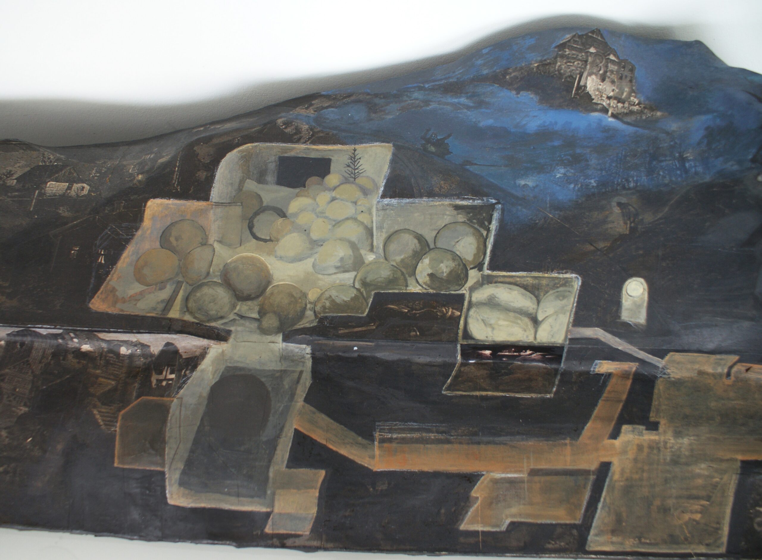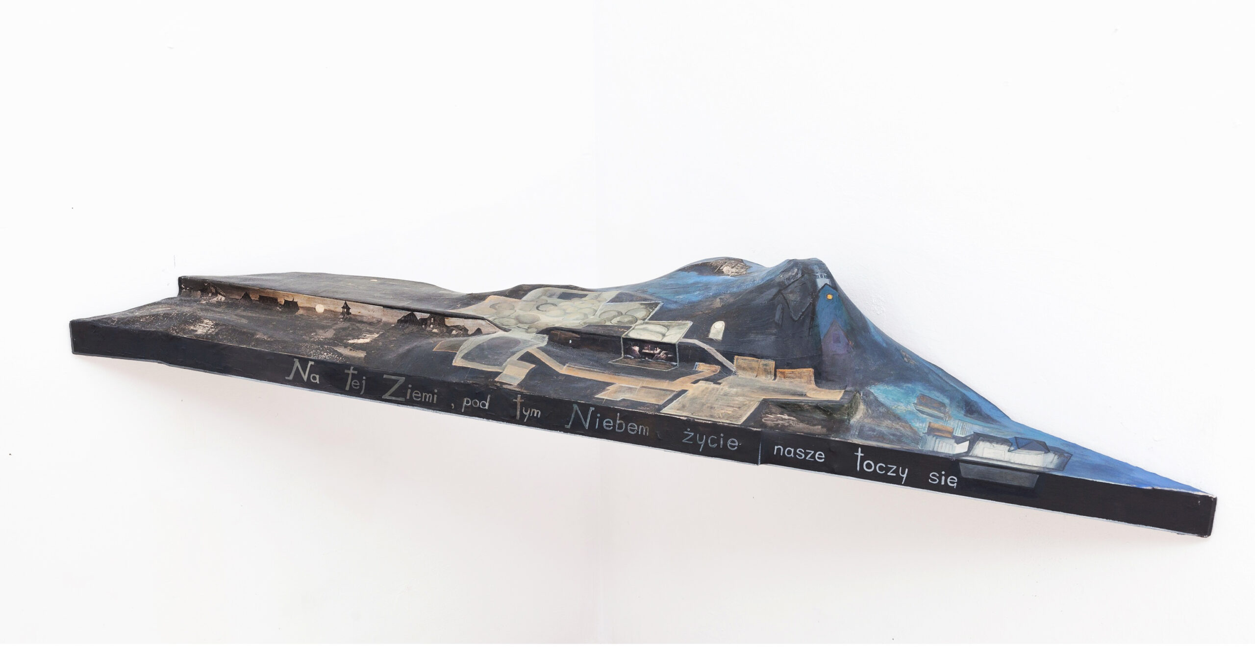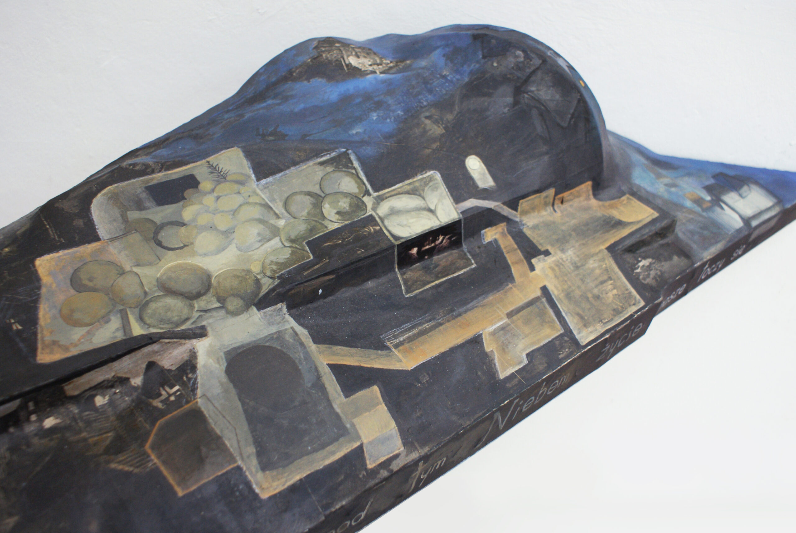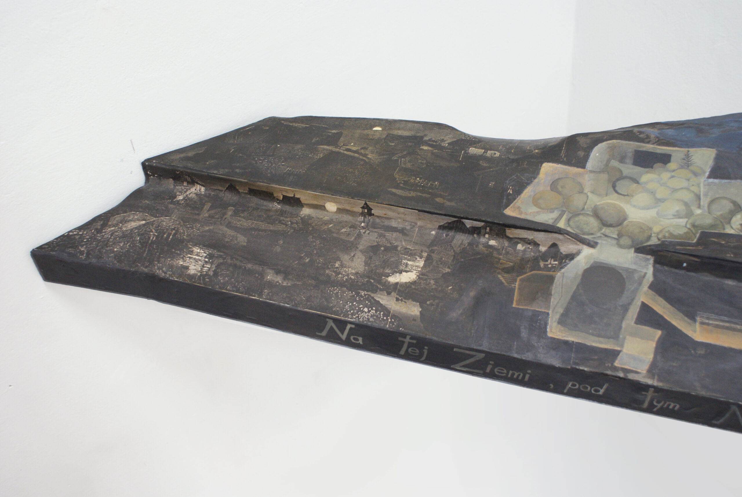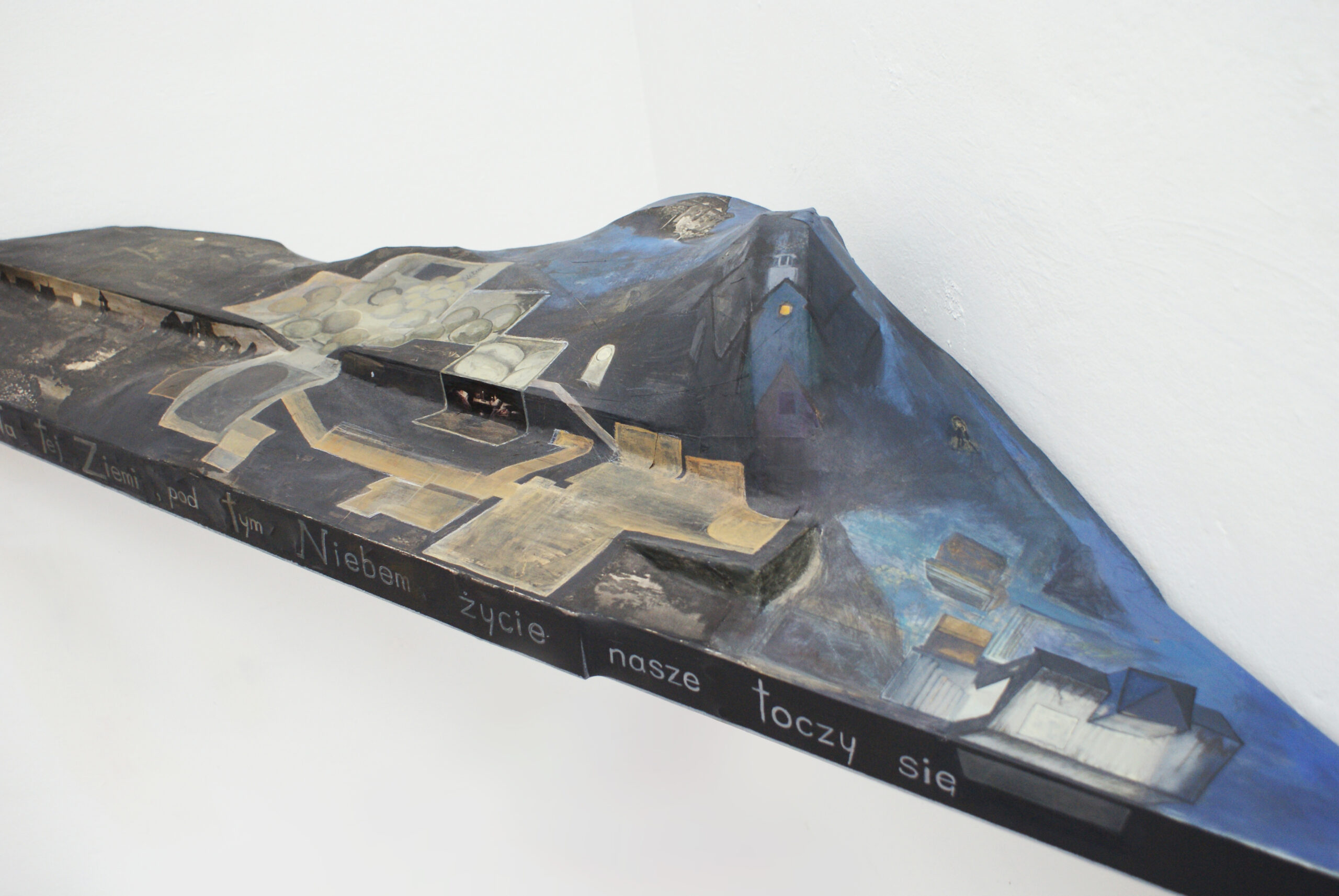 The title can be translated to The Wedge. The sentence written on the front of this piece comes from a song by Tadeusz Woźniak entitled Pośrodku Świata (In the Middle of the World), which was used in the opening credits of the tv series Plebania (Presbytery).